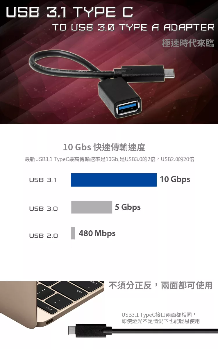 - ?享受 USB 3.1 高達10 Gbps 的資料傳輸速度. 向下相容 USB 3.0 devices (5 Gbps) 和 high speed USB 2.0 (480 Mbps)。